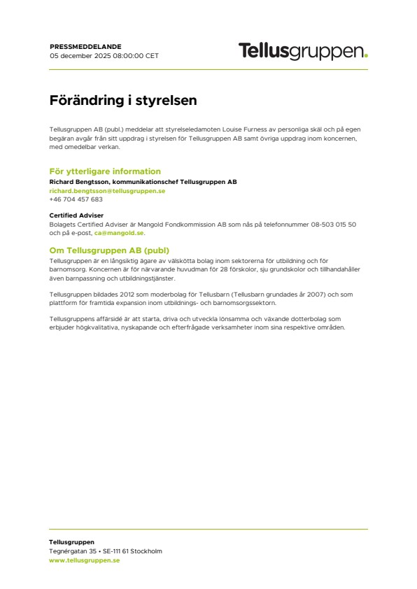 Tellusgruppen AB (publ.) meddelar att styrelseledamoten Louise Furness av personliga skäl och på egen begäran avgår från sitt uppdrag i styrelsen för Tellusgruppen AB samt övriga uppdrag inom koncernen, med omedelbar verkan.