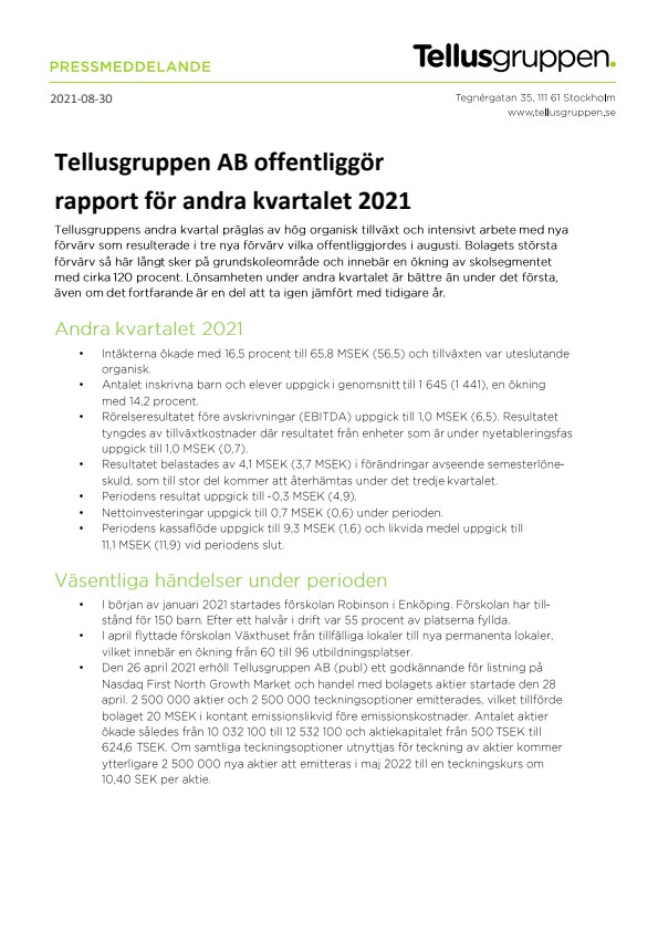 Denna information är sådan information som Tellusgruppen AB (publ) är skyldigt att offentliggöra enligt EU:s marknadsmissbruksförordning. Informationen lämnades för offentliggörande 2021-08-30 klockan 8.30 CEST.